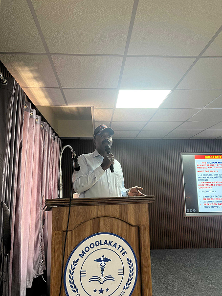 A Career Guidance Program on Military Nursing Service was conducted at Moodlakatte College of Nursing, Kundapura on 04th February 2026 from 10:00 a.m. to 12:00 p.m. The program was graced by the Chief Guest, SHAMKANTH S NAGEKAR SUBEDAR MAJOR (Retd.) SIGNALS