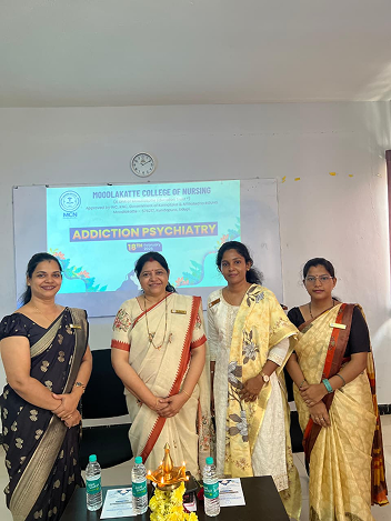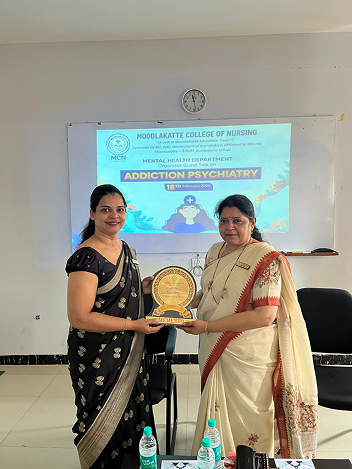 Moodlakatte College of nursing, Mental health department organized a guest talk on Addiction psychiatry on 18th February 2026 by esteemed Guest Speaker Mrs . Sapna Ganesh, Student Wellbeing Adviser IMJ Institutions. Prof. Jennifer freeda Menezes and Vice principal Mrs. Roopashree K S of Moodlakatte college of Nursing presided over . The program focused on key aspects of addiction psychiatry, including awareness, prevention, and management strategies relevant to nursing students. And delivered insights on student wellbeing in the context of addiction challenges, promoting mental health support. The program hosted by Mrs Chethana R Assistant Lecturer Moodlakatte College of nursing.