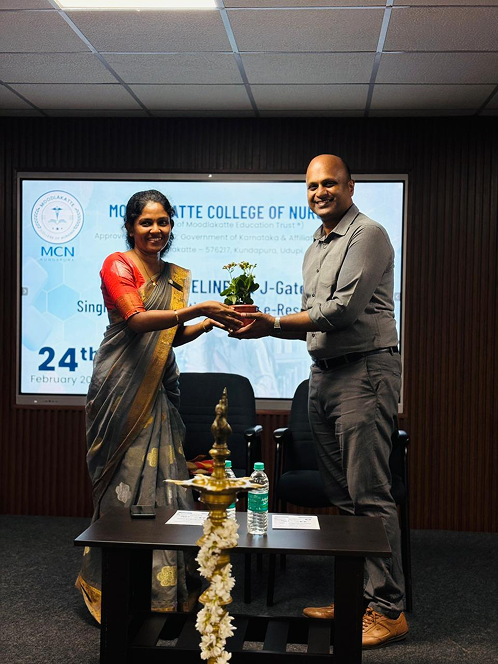 Moodlakatte College of nursing, Library Committee organized a guest talk on Exploring HELINET and J-Gate, on February 24,2026 in the presence of Vice principal Mrs. Roopashree K S .The esteemed guest Speaker Mr.Ratish Iyer, Manager In-Charge of Training Division at Informatics Publishing Ltd, Banglore. The program focused on key aspects of empowering students to navigate premier research databases for evidence-based learning in nursing and health sciences.Today’s program is especially significant for our nursing students as it unlocks gateways to vast journals, articles, and resources essential for academic excellence and clinical practice. The program hosted by Mrs Chethana R Assistants Lecturer Moodlakatte College of nursing.