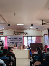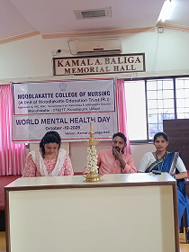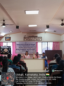 Moodlakatte College of Nursing celebrated Mental Health Day at A.V. Baliga Memorial Hospital to create awareness about the importance of mental well-being. The program was graced by Mrs. Soujanya Shetty, Administrative Officer, and Mr. Suresh, Social Worker, from A.V. Baliga Hospital, along with Mrs.Chethana R, Assistant Lecturer, Moodlakatte College of Nursing. The program began with a formal inauguration by lighting the lamp. Ms. Sincy served as the anchor for the event and delivered the welcome address as well as the vote of thanks. Ms.Tesca presented the significance of the day, by highlighting the theme of World Mental Health Day 2025(Access to Services – Mental Health in Catastrophes and Emergencies). Students performed a role play based on the theme , emphasizing various aspects of mental health awareness and community well-being.