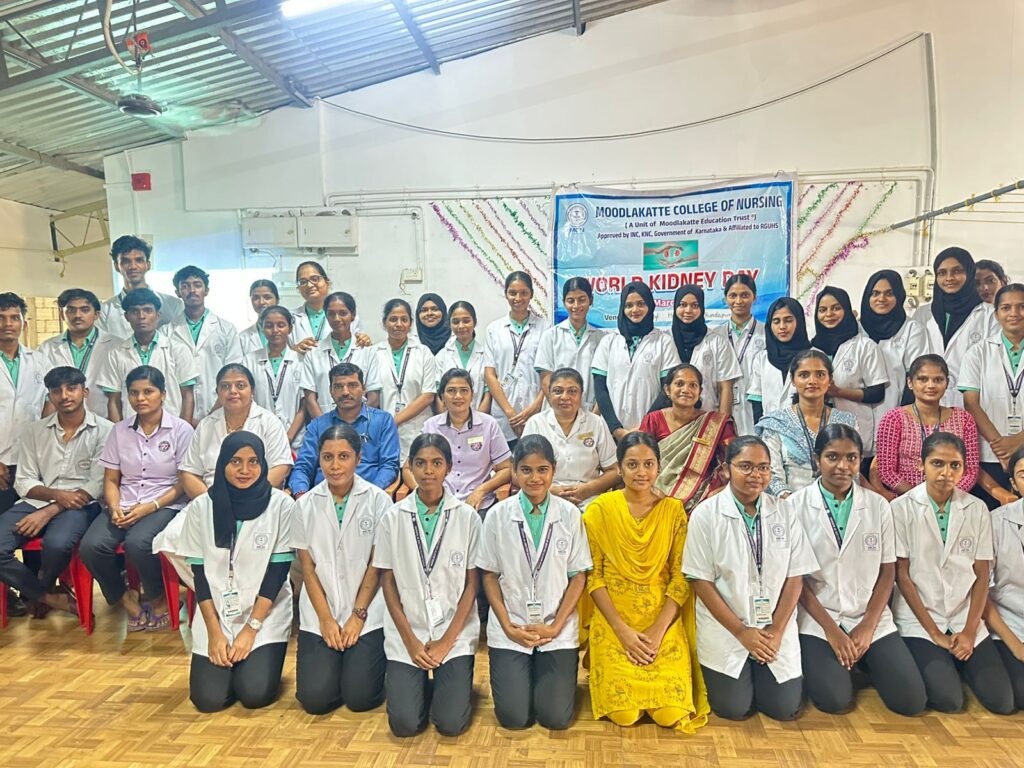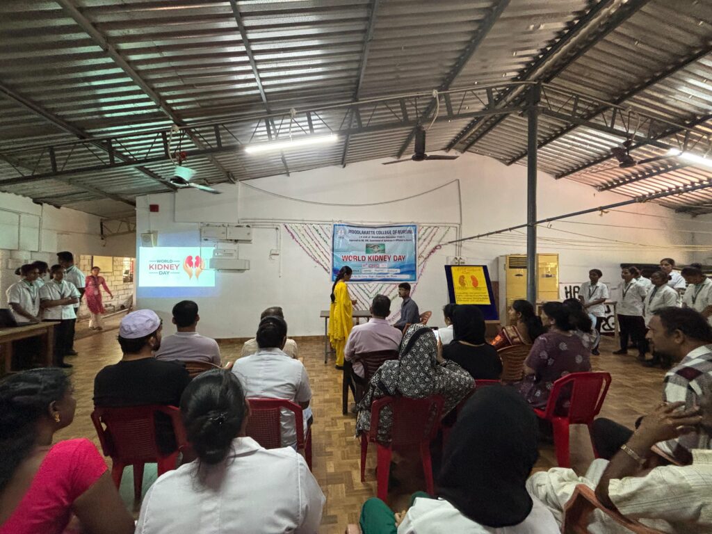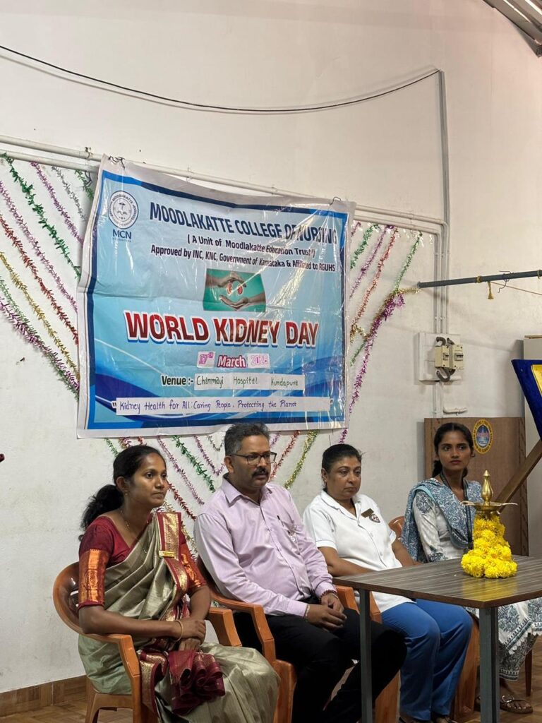 The World Kidney Day was celebrated on 17th March 2026 at Chinmayi Hospital, Kundapura, organized by the Department of Adult health nuring ,Moodlakatte College of Nursing. The program commenced with the ceremonial lamp lighting, which was gracefully performed by the Nursing Superintendent Iyeda Almeda and mr. Pradeep kumar ,quality head along with Lecturer Mrs. Anjali and Ms. Rakshitha. The event aimed to create awareness about kidney health under the theme “Kidney Health for All: Caring People, Protecting the Planet.” The program was effectively conducted by the 2nd year nursing students. The Master of Ceremony (MC) was carried out by Ms. Rakshitha and Ms. Nikitha, who managed the event smoothly and engagingly. Various activities like role play , slideshow, flash card ,chart and informative sessions were conducted to highlight the importance of kidney care and preventive measures. The program concluded with a vote of thanks delivered by Mr. Chiranjivi, who expressed gratitude to all dignitaries, participants, and organizers for making the event successful. Overall, the program was informative, well-organized, and successful in spreading awareness about kidney health.